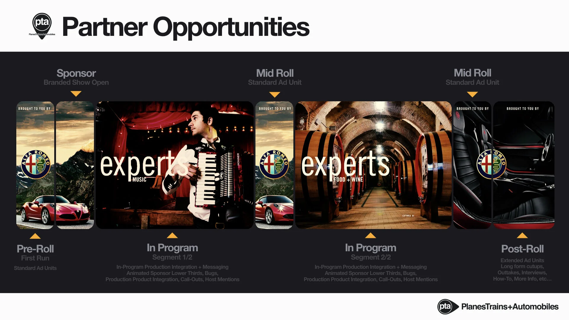 PTA (PlanesTrains+Automobiles) is an ad-supported streaming television channel on Roku, Amazon FireTV that’s dedicated to travel lifestyle. It’s also available as a 24-hour linear television channel in U.S. hotel rooms via Sonifi Solutions, as part of Delta Airlines’ in-flight entertainment system and in airports nationwide via the ClearTV network.